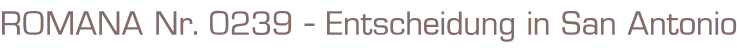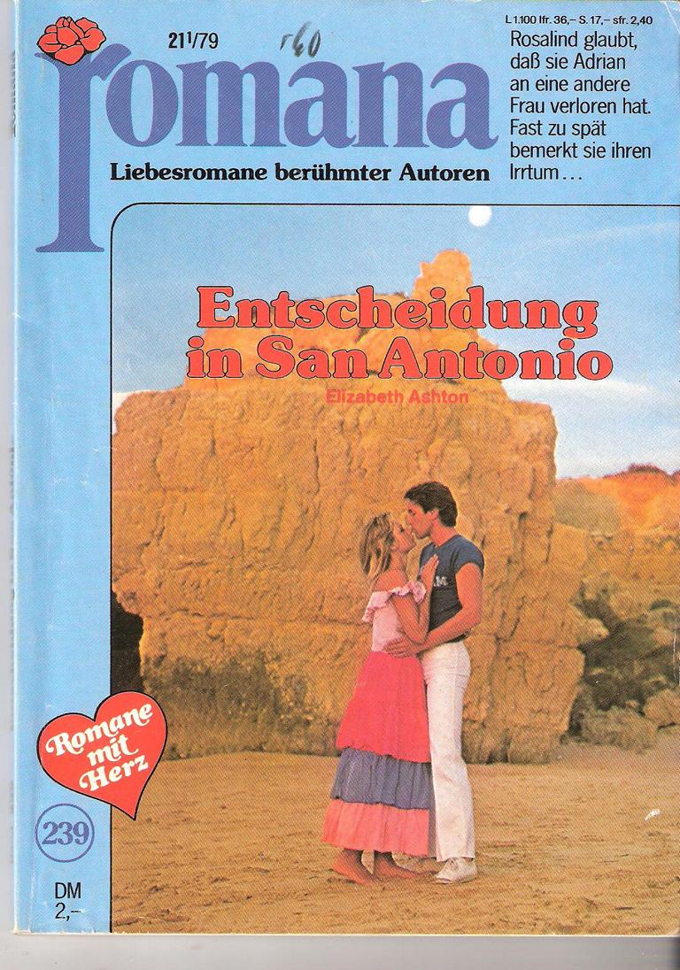 ROMANA Nr. 239Titel: Entscheidung in San AntonioAutor: Elizabeth AshtonCora Verlag 1979Heft, Format: 13 cm x 18 cmGewicht: 100 gZustand: gut, leichte Gebrauchsspuren