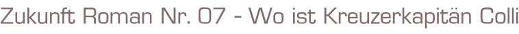 Titel: Wo ist Kreuzerkapitän CollinsAutor: W. BrownZukunft Roman Nr. 7Verlag: Mehrwert Verlag, LandauRomanheft 64 SeitenFormat: 15 x 22 cmZustand: sehr gut erhaltenes Exemplar