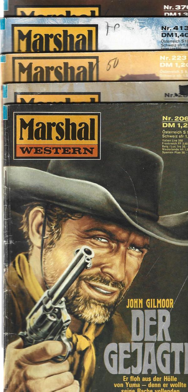 Marshal Western 5 HefteNr. 206 Der Gejagte von John Gilmoor.Nr. 281 Rauhe Meilen nach Pecos von Scott E. Scott.Nr. 223 Für eine Handvoll Nuggets von H. S. Sharon.Nr. 413 Im Bau der Tollen Hunde von John Miles.Nr. 376 Der Revolvermann kommt zurück von Matt Brown.Erich Pabel Verlag5 Romanhefte á 62 SeitenFormat: 15,5 x 22,5 cmZustand: gebraucht, gut
