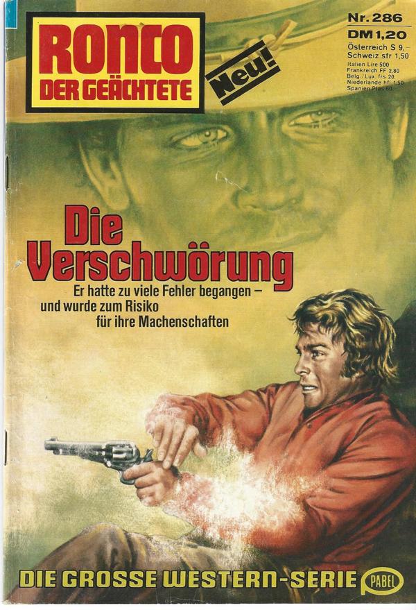 Ronco der Geächtete Nr. 286Titel: Die VerschwörungAutor: Earl WarrenVerlag: Erich Pabel Verlag, Rastatt 1977Romanheft 65 SeitenFormat: 15,5 x 22,5 cmZustand: sehr gut