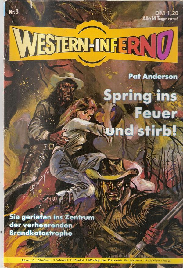 Western-Inferno Nr. 3 Titel: Spring ins Feuer und stirbAutor: Pat AndersonVerlag: Wolfgang Marken Verlag, KölnRomanheft, 65 SeitenFormat: 15,5 x 22,5 cmZustand: gut, leichte Gebrauchsspuren