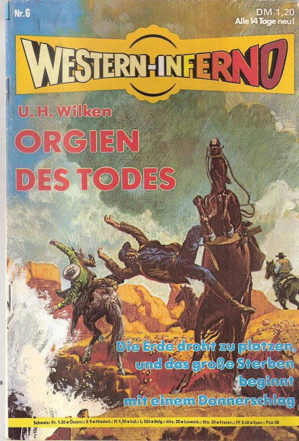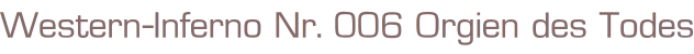 Western Inferno Nr. 6Titel: Orgien des TodesAutor: U.H.WilkenVerlag: Wolfgsng Marken Verlag, Köln 1975nRomanheft, 66 SeitenFormat: 15 x 22,5 cmZustand: gut,
