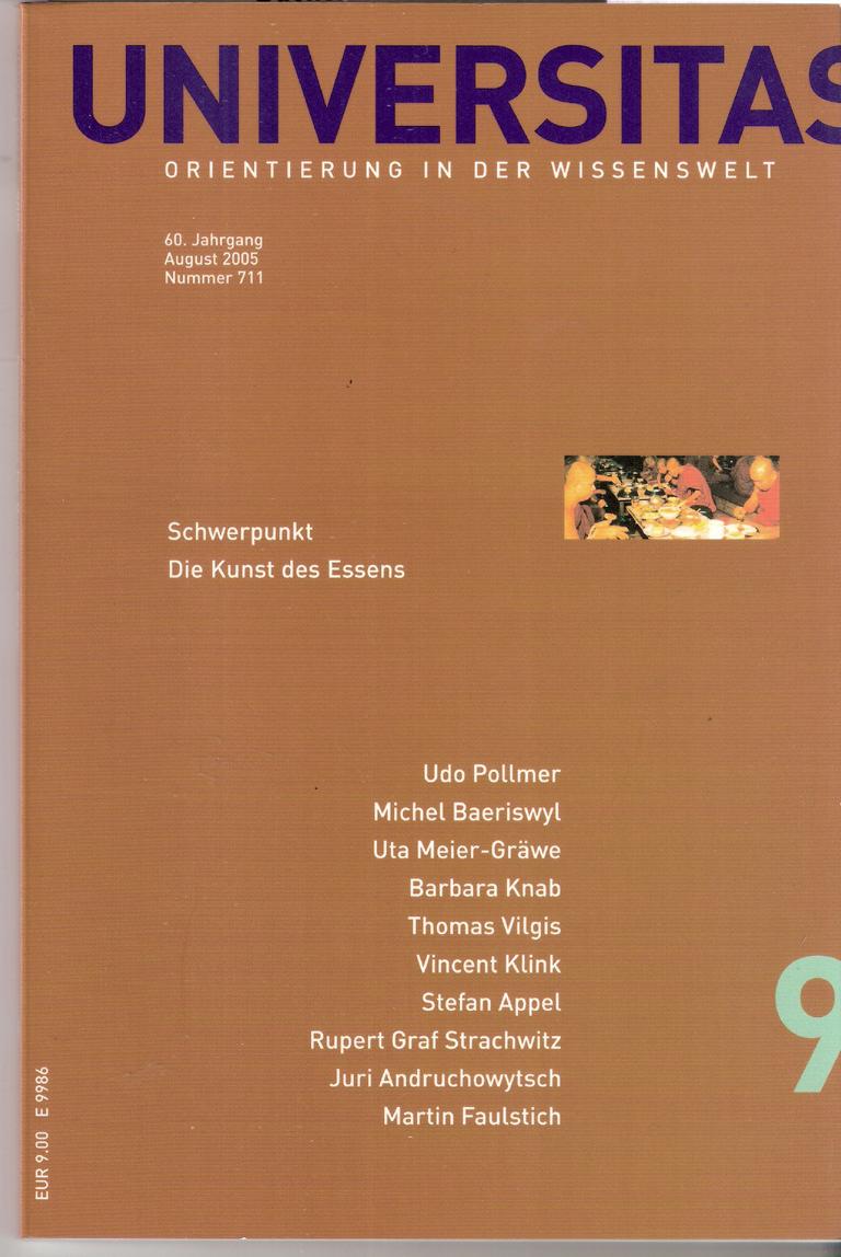 Titel: Universitas Nr.711 Orientierung in der WissensweltSchwerpunkt Die Kunst des EssensISSN 0041-9079Herausgeber: Dr.Christina Rotta, Dirk KatzschmannVerlag: S. Hirzel Aug. 2005 60. JahrgangSoftcover, 885 - 989 SeitenFormat: 15,5 cm x 23 cm x 0,5 cmGewicht: 265 gZustand: gut